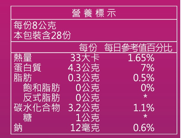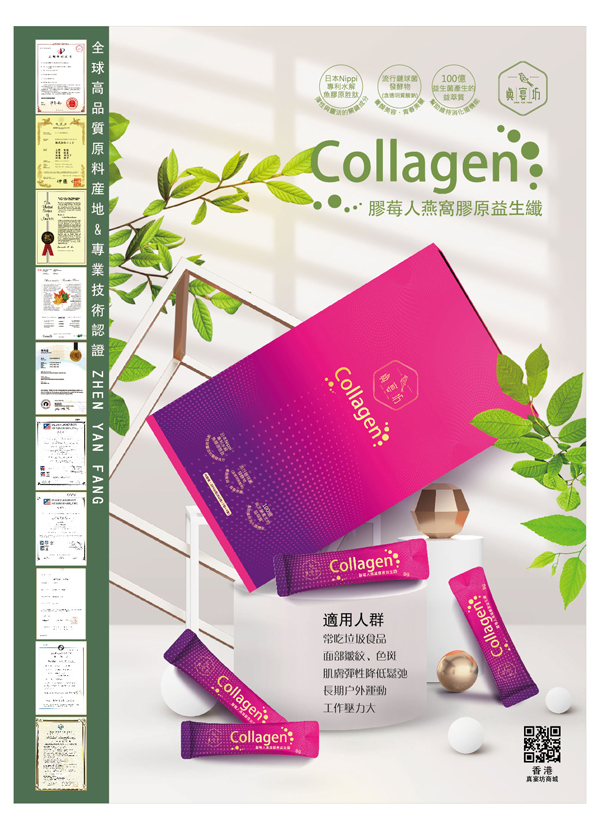 • 採用日本Nippi專利魚膠原胜肽,3000~5000道爾頓小分子易吸收,搭配臺灣熱鎖存技術純煉提析之後生元-益萃質,並添加流行鏈球菌發酵物(含透明質酸鈉-玻尿酸)及多種天然植物萃取物,使身體元氣滿滿、養顏美容、青春美麗